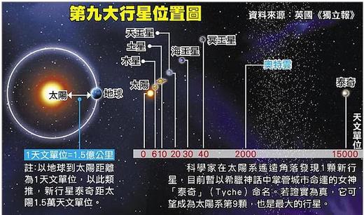 2011年 02月16日 蘋果日報【蔡佳慧╱綜合外電報導】太陽系8大行星可能又將恢復為9大行星了!科學家在太陽系遙遠角落發現1顆新行星,大小估為木星的4倍,是地球的5300倍,目前暫以希臘神話中掌管城市命運的女神「泰奇」(Tyche)命名。若證實為真,它可望成為太陽系第9顆,也是最大的行星。