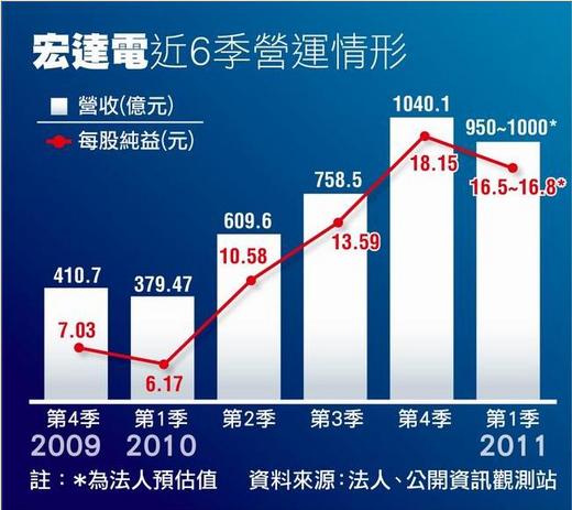 在Desire HD、Desire Z及Windows Phone 7系列手機出貨帶動下,宏達電本季營運淡季不淡,內部預估,出貨量上看850萬支、營收挑戰940億元,由於1月營收表現優於預期,外界預估,宏達電第1季營收有挑戰1000億元實力,每股純益超過16元。