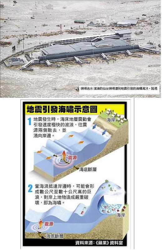 本次地震重災區仙台市有100萬人口,濱臨太平洋,強震造成海岸出現10公尺、超過3層樓高的海嘯,從出海口附近的名取川灌入,逆流而上,夾雜泥土的海水一路淹吞船隻、汽車、田地和民房,所經之處任何物件全遭滅頂,甚至連地震造成的火災也吞噬,民眾根本來不及逃生。