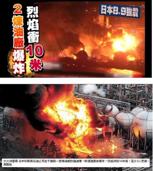 日本第4大煉油公司科斯莫石油公司在千葉縣一家大型煉油廠的儲油槽,在昨天強震後爆炸起火,烈焰和濃煙直沖雲霄,達數十米高,場面驚心動魄,至少造成3人受傷。另一大型煉油廠JX Nippon石油能源公司已暫停包括仙台在內三個城市的煉油廠營運。此外日本鋼鐵工程控股公司(JFE Holdings)位於千葉地區的鋼鐵廠也發生火災,造成5人受傷。