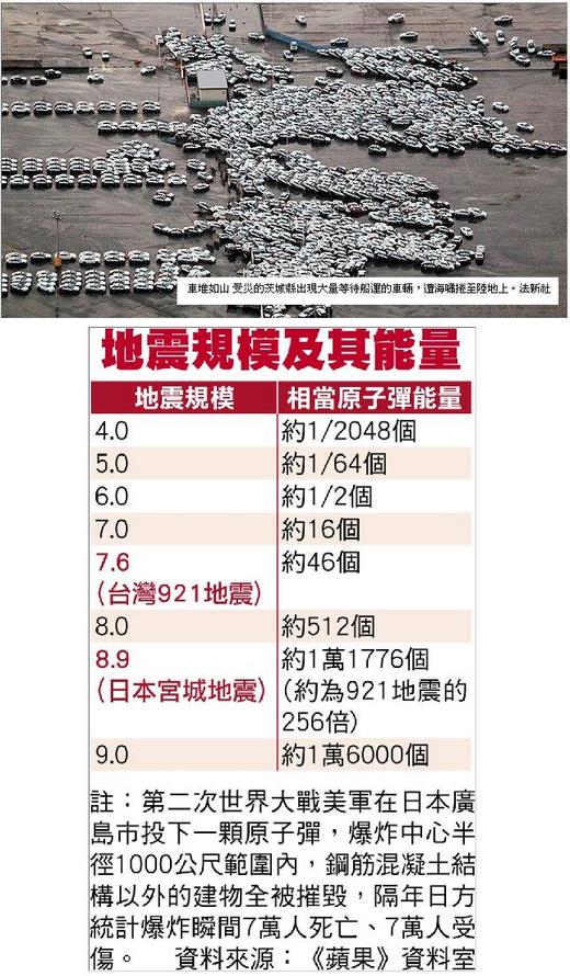 自1891年以來,日本出現過7次規模8以上強震。英國廣播公司(BBC)指用來衡量地震大小的「規模」(Magnitude)每升一級釋出的能量就增加32倍。跟1995年規模6.8的阪神大地震相比,昨天的強震釋出的能量是當時的約1400倍。