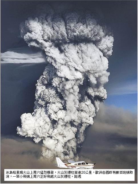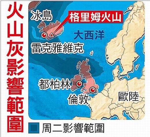 冰島格里姆(Grimsvoetn)火山上周六爆發,20公里高的火山灰直衝天際,火山灰先往北飄到斯堪地那維亞半島,再往西南飄向英國,英國北部的蘇格蘭、北愛爾蘭首當其衝,近10處機場關閉,數千名旅客受困機場,英國國內航班取消,氣象預測一度指出,火山灰可能逼近英國南部,威脅倫敦希斯洛機場。
