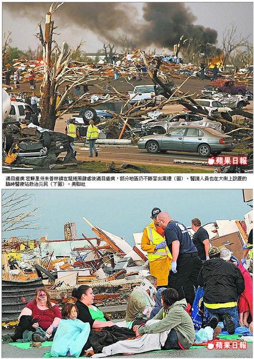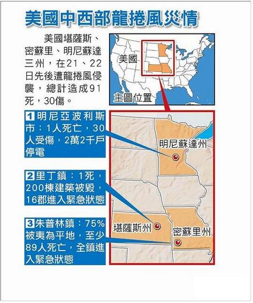 【歐陽梅芬╱綜合外電報導】上個月底美國阿拉巴馬等七州遭到龍捲風襲擊,造成逾330人死亡。不到1個月,美國中西部堪薩斯、明尼蘇達州和密蘇里州,在21、22兩日又先後遭龍捲風襲擊,總計造成91人死亡、30人受傷與龐大財產損失。其中密蘇里州朱普林鎮災情最慘重,死亡人數有可能攀升到100。