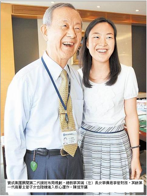 2011年 06月16日【陳文蔚╱台中報導】寶成集團總裁蔡其瑞昨於股東常會後首度談到接班布局,蔡其瑞透露:「近年已陸續將主要持股轉移給她(指長女蔡佩君)並信託,財務也由蔡佩君接手。」此外,包括寶成工業(9904)董事長蔡其建、集團執總蔡乃峰及裕元工業董事主席蔡其能3人子女也都已進入集團相關事業研習,延續第一代相互合作、共創事業的精神。