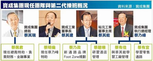 據了解,寶成集團第一代蔡其瑞兄弟與叔姪的子女,目前投入領域上集團管理到廠務、通路布局甚至到服務業都已就定位,接班雛形已然顯現。