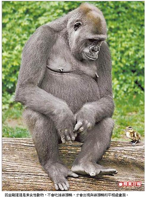 新竹市立動物園長洪明仕表示,圖是紐約布朗動物園的金剛猩猩,看來好像和一旁綠頭鴨成為好朋友。金剛猩猩的原產地在非洲熱帶雨林,屬於瀕臨絕種的動物;綠頭鴨則分布在溫帶及亞熱帶,為相當常見的鳥類。如果不是在動物園內,不可能有機會見面,這隻母金剛猩猩表現出性情溫和,雖具有孔武有力的外表,但因為是素食性的動物,多以植物或果實為食,所以不會吃掉綠頭鴨。