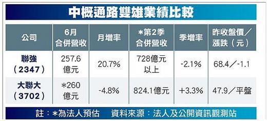 2011年 07月08日【蕭文康╱台北報導】中概電子通路漸走出淡季影響,聯強(2347)昨公布6月營收,在智慧型手機及平板電腦熱銷帶動下,單月合併營收257.6億元,月增20.7%,第2季合併營收728億元,季減2.1%。另外法人預估大聯大(3702)6月合併營收約260億元,月減4.8%,但第2季合併營收824.1億元,季增3.3%,則達財測中高水準。