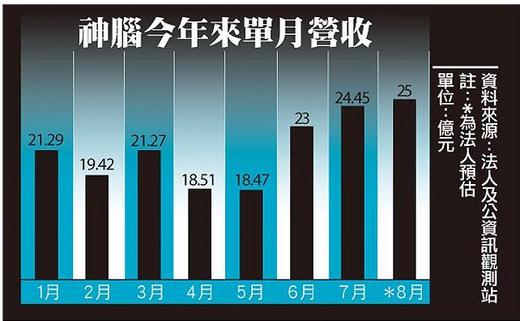 不願具名的法人預估,神腦7月營收24.45億元,月增6.3%並連續2個月創下新高後,8月還有機會超越7月表現續創新高,推估第3季營收將達68~70億元,季增13.3~16.6%,單季營收將再度創下單季新高。