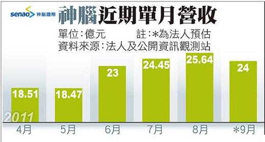 不願具名的法人表示,神腦受惠於平板電腦及智慧型手機新機上市效應,加上新門市挹注部份營收,神腦9月營運雖已過銷售旺季,但表現仍將維持在旺季水準,推估約與上月持平或微幅衰退,累計第3季營收將達73億元左右,較上季的近60億元成長逾2成,將創歷史新高。