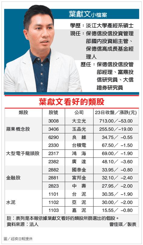 葉獻文指出,歐美國家消費力道減弱,拖累出口導向的台灣電子產業,雖然近期台幣貶值讓電子股跌幅相對較小,但如半導體產業目前庫存仍高,電子股未來前景仍有隱憂,看好的還是蘋果概念股及大型電子龍頭股。