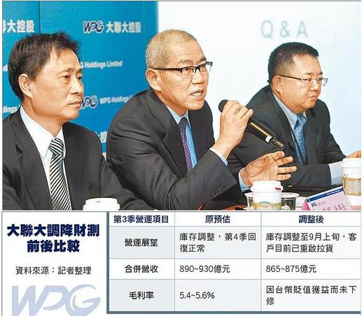 【蕭文康╱台北報導】電子零件通路龍頭大聯大(3702)因受到客戶持續調整庫存,加上電腦相關產品9月上旬前銷售不如原預期,昨宣布調降今年第3季營運目標。財務長袁興文表示,單季合併營收865~875億元,季增率由原預估的8.5~12.7%下修至4.5~5.9%,單季獲利則因台幣近期貶值支撐而未跟著下修。