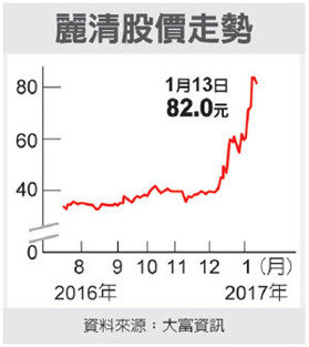 中國大陸最大LED車燈模組廠麗清科技去年12月19日以30元掛牌上市,當天股價就以46元開出,漲幅53.3%,一個月不到,上周五(13日)收盤達82元,漲幅驚人、高達173%。