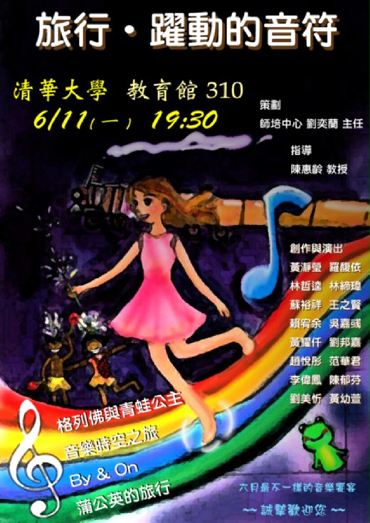 『旅行●躍動的音符』發表會透過音樂來感受人生中不同的旅行‧最大的挑戰在於每位參與演出者都要自己創作音樂來豐富這一趟旅程‧不管是格列佛與青蛙公主、音樂時空之旅或By & On還是蒲公英的旅行‧都在同學彼此間的腦力激盪中創造出他們獨一無二的人生之旅‧相信以他們的聰明才智以及通力合作中‧必定是一個令人驚嘆的旅程。