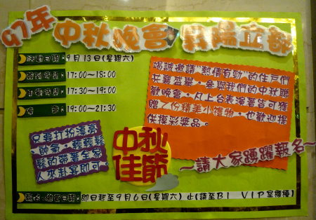 每年中秋節社區都會辦大型的活動,算起來也是一年一度最浩大的活動,今年輪到我主辦,才剛辦完中元普度,就立即著手這個活動,真的是忙得不可開交。
