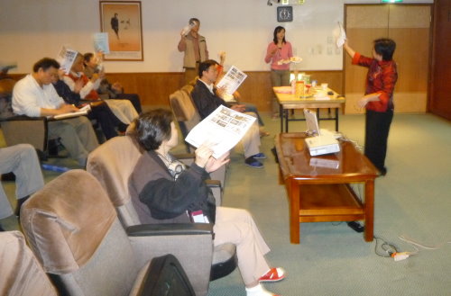 接著帶他們到地下五樓的資源回收區,那裡我們做了各種分類,配合圖片與中英文說明,讓所有住戶一目了然,以最方便方式做好資源分類。譬如一般家庭硬塑膠、保特瓶、保麗龍,此外還有玻璃瓶、軟塑膠、鋁玻箔、鋁罐、鐵罐、廢紙…等,並將垃圾及儲餘和推肥放在大的冷凍庫中,做最好的衛生把關。參觀完就進入我們的會議室,由我先開場,接著環保署長官致詞,然後是財團法人產業基金會的孫先生說明相關法歸,最後再由我來介紹本社區環保的實施狀況。