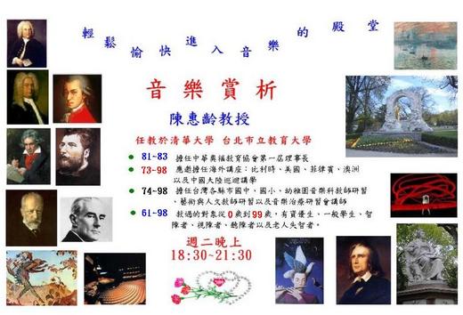 今年應竹北社大之邀開設"音樂賞析"課程,從音樂的功能、台灣的童謠、民謠到世界各國的民謠,以及經過千錘百鍊留芳千古的世界名曲,透過多媒體影音多元化的活潑教學,在唱唱跳跳、敲敲打打中,讓您不只倘佯在美妙的音樂世界裡,還能深刻體驗音樂創作的樂趣。