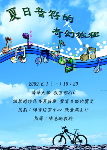 夏日音符的奇幻旅程由八組同學表演,他們發揮創意與團隊精神,貢獻個人智慧,要帶給每一位觀賞者有個別開生面的旅程,也許在過程中您會聽到一些耳熟能詳的音樂,勾起您兒時回憶,或者帶您到某個遙遠的國度,讓您會心一笑…。感謝清大師培中心陳素燕主任的大力支持,希望這場音樂發表會讓您在炎炎夏日中有個特別美好的聽覺與視覺之旅。
