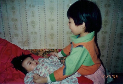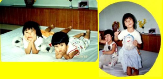 大女兒兩歲時我就帶在身邊,有時候我上課她就在一旁看,有一次某位老師沒來,她還說:「那位留長髮的阿姨沒來,我打電話叫她來。」還真充當起點名的人呢 。當我的二女兒來報到後,她就主動負起照顧妹妹的責任,會自動跟妹妹玩,把從小接受我訓練的都搬出來,我告訴她長姊如母的事,以後我有事情要出門,她就說:「我知道了長姊如母,妳快出去吧 !不要遲到了。」