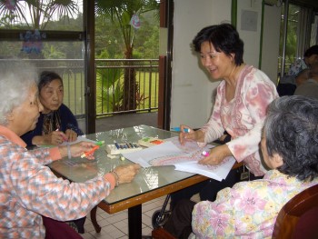 今天嘗試讓老人們聽音樂畫圖,因為這一首音樂在前幾週已經透過各種方法讓他們感受,譬如拍手敲樂器與跳舞,在畫圖之前我先示範如何把對音樂的感覺畫出來,然後每個人一張白紙,並且請他們選自己喜歡之顏色的彩色筆,有的人很快的說他不會畫,於是我便一桌桌去說明,有的很高興問我怎麼畫 ?我說要注意聽音樂喔 !他們便很高興的說好啊 !;事實上聽音樂畫圖對這些八九十歲的老人們可能是從未有的經驗,所以有的人就馬上反應說自己沒讀過書不會,我就要耐心的解說只要聽音樂就好了,畫出對音樂的感覺,如果音樂往上爬就畫出向上的樣子,如果音樂有旋轉的感覺就畫出繞圈圈的樣子。由於他們的動作比較慢,所以我讓他們多聽幾次,接著大家把作品給大家觀賞,發覺每一個人都很興奮的秀出自己畫的圖,而且大都能說出自己心裡想表達的,當大家報以熱烈的掌聲時,都樂得笑不攏嘴,而每次我對他們說你畫得很棒,他們都會謙虛的說那有,是老師會教;請他們說明自己所畫的時,陳爺爺說像流水般,李爺爺畫的像心電圖彎彎曲曲,陳奶奶畫的圖和音樂非常相配,並且會用不同的色彩,婁老爹說他畫山水畫,馬爺爺迫不及待要把他畫的兩張作品與大家分享,他畫的是高高低低的山坡和海浪,李爺爺說畫的是漩渦,當過數學老師的爺爺說音樂像心情起伏。