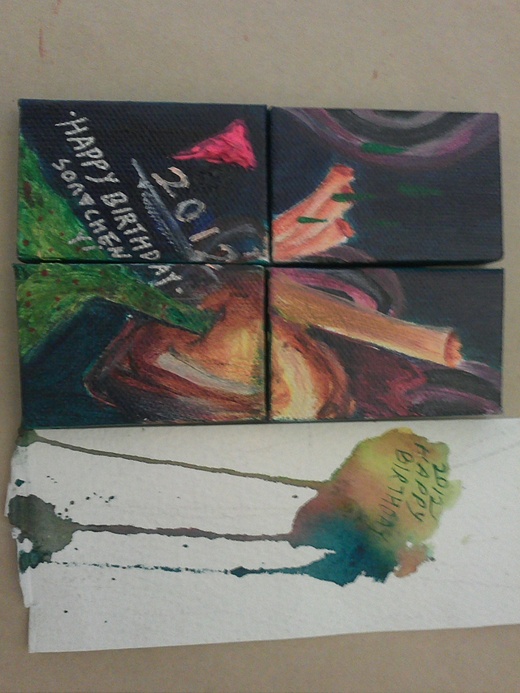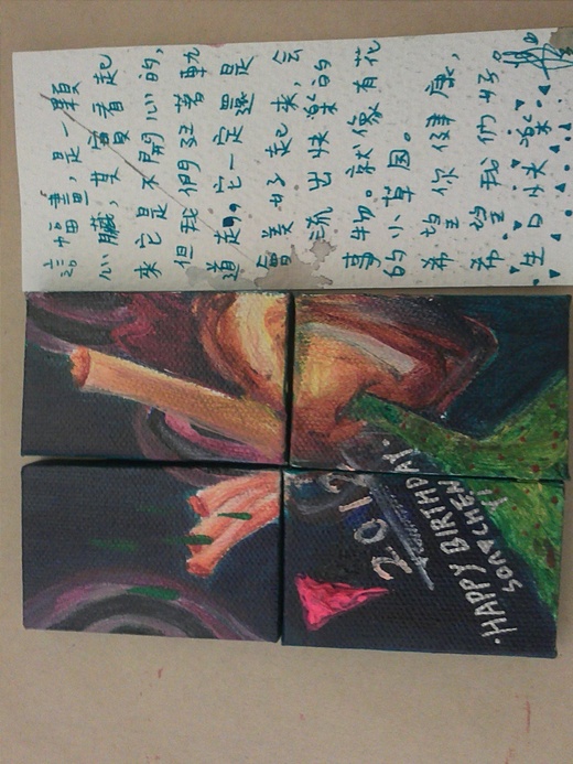 四幅小油畫拼起來的油畫,外加一張水彩卡片
