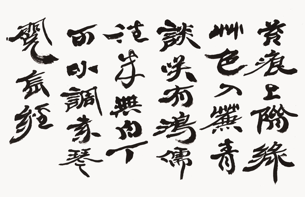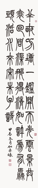 (由上而下依序,第一張:行書〈浩歌.狂語〉五言聯;第二張:篆書〈朱熹觀書有感〉條幅;第三至五張:隸書〈陋室銘〉 中堂)