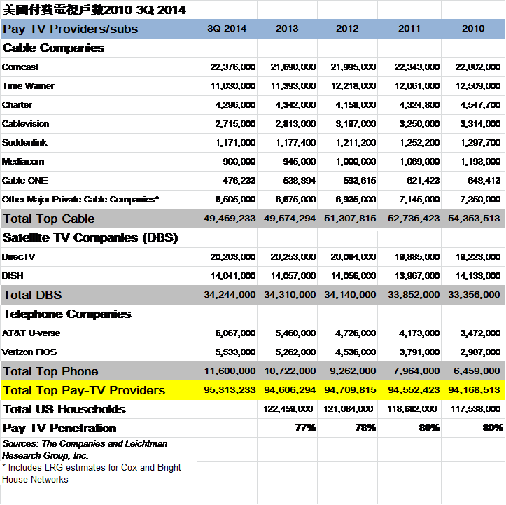 2010至2014第三季,有線電視少了五百萬戶,可衛星電視卻新增一百萬戶,封閉型IPTV則大幅成長五百萬戶。整體,上揚約一百萬戶,零電視如果是真的,來得很慢,相當隱形。