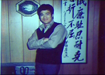 一代巨星李小龍在崔將軍所提的跆拳道精神書法前留影