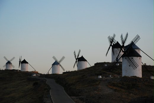 一路上,一切都是那麼的順利、美好,所以我們在預定的時間就到達了托雷多的前一站—康斯埃古拉,這個小鎮以11座美麗的風車聞名。車子進入這個小鎮時,發現整個城鎮似乎是個空城,幾乎算是無人煙,真是怪的很…… 小驢子沒有這個小鎮的地圖,所以車子在小鎮裡漫無目的的亂開;不過,沒多久就發現矗立在山丘上的風車群,我們在完全沒有路標的情況下,就大膽的朝著風車群的方向開去…… 沒想到~~~ 或許是小鎮太迷你,道路不複雜,居然很順利的就讓我們找到開往山丘的路,Lucky!