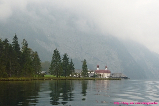 PM12:00左右,我們搭船返回St.Bartholomä。St.Bartholomä修道院最醒目的就是它有如洋蔥般的紅屋頂,配上黃色的窗框及白色的牆壁,造型非常的『卡通』,十分特別。