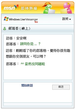 把 「MSN 即時熱線」HTML 程式碼加在部落格,其他人就可以在網路上得知你的 MSN 連線狀態,而來訪的訪客,即便不在你的連絡人名單中,還是可以直接與妳展開即時的文字對談。