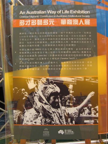 展場有以10年來說明的百年澳洲重要華人,很有意思。另外有一牆美美的「秀出您眼中的澳洲」攝影作品展秀出為主,設計不錯,但當初徵照片的辦法怪怪的,我沒去參加,我看我自己的澳洲照片可能更精彩。