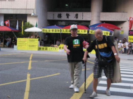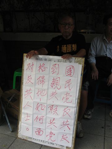 一直每天到立法院群賢樓,河南榮民老伯伯,今天穿了件「勿通匪類」的T恤,和我今天去支持蔡丁貴教授的公投補正,繞行立法院的制服一樣。老伯伯,身背的標語改成: