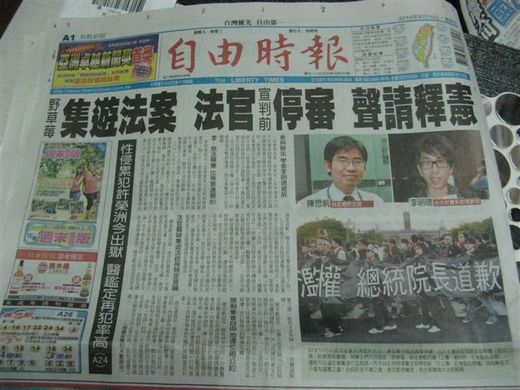 2010-9-10自由時報〔記者劉志原、林俊宏/台北報導〕台大社會系助理教授李明璁參與前年抗議中國海協會長陳雲林來台警方執法過當的「野草莓」靜坐活動,遭檢察官依違反集會遊行法起訴,台北地方法院原定昨天宣判,但承審法官陳思帆認為,集遊法有歧視特定言論疑慮,不僅有違反憲法比例原則及侵害人民集會自由之虞,也可能違反保障人權「兩公約」,昨當庭裁定暫停審理,將全案聲請大法官解釋。