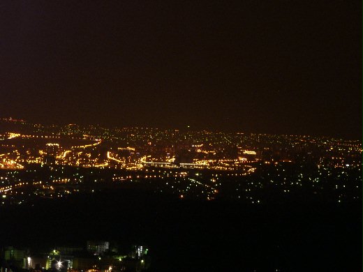 心想:「好樣的,總算給老子爬上來了,」,拭去額頭汗水,往下看去,夜景十分壯觀,腳下萬家燈火,遠處不時閃出一朵朵煙火,迎風而立一股豪情油然而生,總算這番辛苦值得了,看時間,才十一時十分,正準備架起相機時,同行的攝影記者用手電筒照著指標說:「哇,瞭望台還要往上一千公尺。」