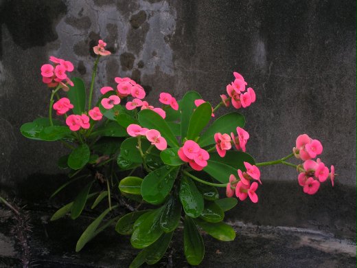 麒麟花,四季開花,全年無休,一盆少少的土壤,仍然開花累累,彷彿怡然自得。寒風中,有她的身影,夏日烈陽下,依然亭亭玉立。傍著斑剝的水泥牆,安安靜靜的延伸自己帶著荊刺的身體,然後開開心心的在長橢圓的葉片中開出圓圓的紅色花瓣。在我的驚奇中,又從原來花片中央,再伸展出像麒麟角一般的新花苞,就這樣層層疊疊的形成自己的部落。
