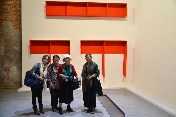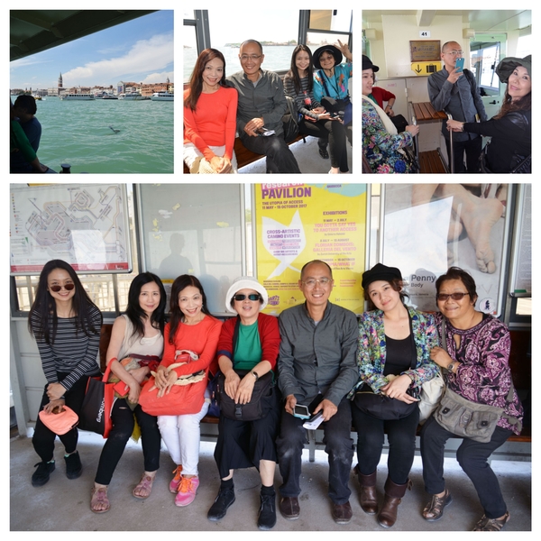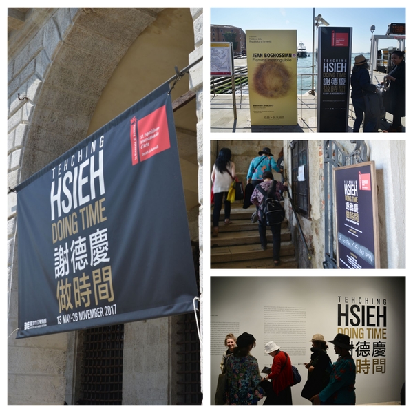 我們一行人,於雙年展參觀結束後,搭船趕到聖馬可廣場碼頭,為的就是來為台灣館打氣,一路上廣告招牌布旗很多,驕傲之餘衝上樓展場,正巧唯一的藝術家謝德慶在場,我們上前表示我們是台灣來的畫家團,希望和他合照一張,沒想到他連正眼都沒看,面無表情,說了聲沒空,傲慢的下樓去了,幾秒鐘都不給,敷衍的話都不說,端了個臭架子走了,留下的是錯愕。