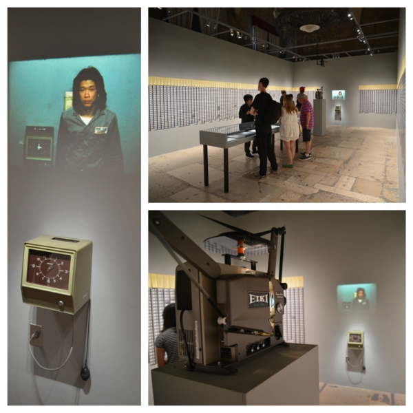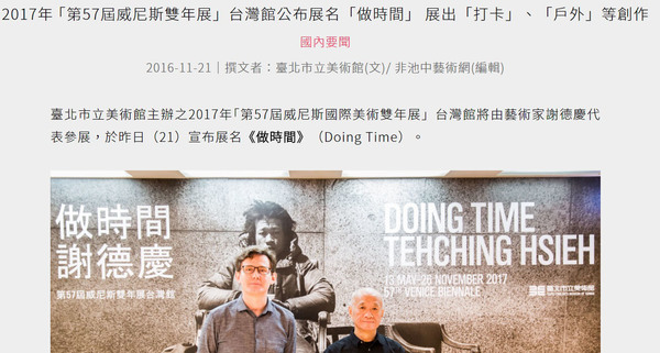 TW臺灣館Taiwan,臺灣謝德慶的《做時間Doing Time》,從他一年露宿紐約街頭,每一個鐘頭打卡一次的兩項行為藝術中,看到藝術家對藝術的執著。謝德慶自己說明:我用一年,因為這是地球繞太陽一周的時間;是人類計算生命的基本時間單位;是生命裡面周而復始的一個循環,這是屬於人類文化裡面都共通的。另外,可能這樣聽起來有些反諷,不過我相信自己具有浪費時間的才能,在這上面有所成。這些「基於規則」的作品則充分建立在人類忍耐力的極限之上。他作品的曝光及隨即引發的藝術界討論,積極引導了當代藝術從70年代向行為表演藝術轉變,同時也導致行為表演作品得以迅速大量進入主流美術館的收藏體系。他在作品中探討了自律、身心約束、自由和暴露的概念,以及人類行為和關係的極限。由此,謝德慶被廣泛認為是觀念和表演藝術史上極具影響力的人物。