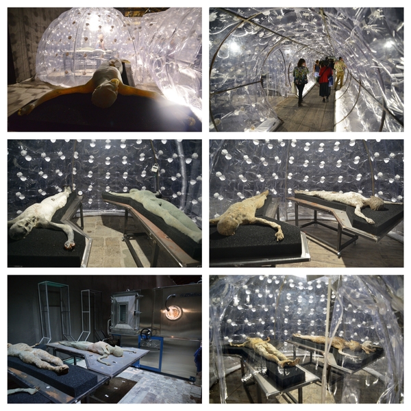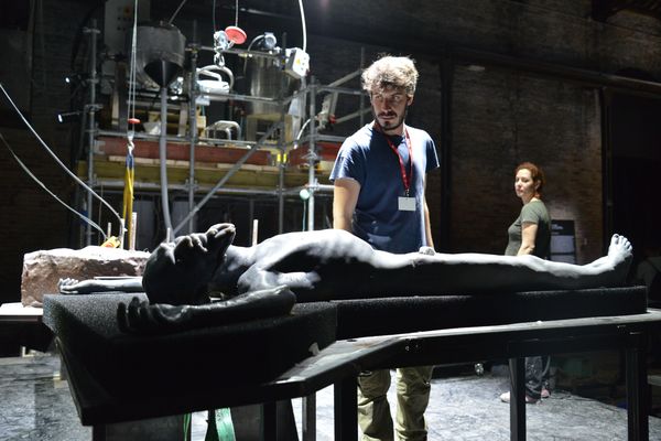 與外面的花園場景形成鮮明對比,義大利館內部的這場演出堪稱本屆最為驚悚的作品!黑暗的燈光下,觀眾被引入一間散發著奇怪味道神秘、破舊、龐大的實驗室空間,自然散發的寒冷感,令人有些毛骨悚然。