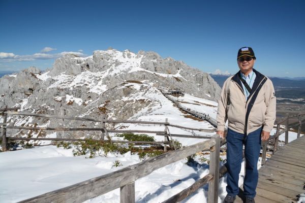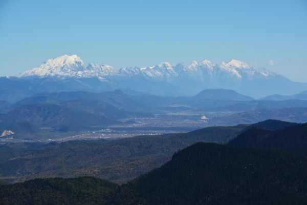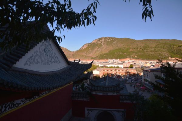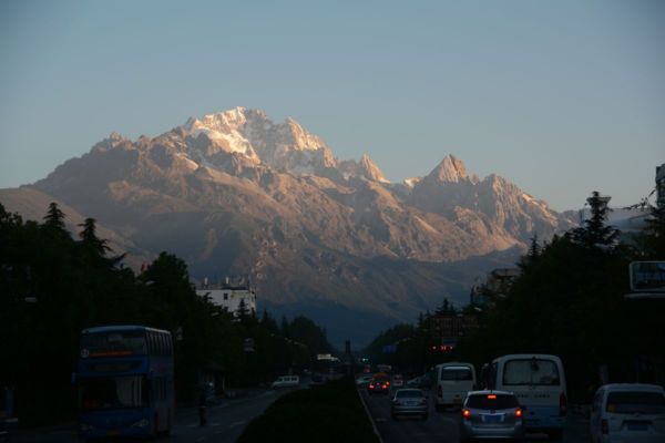 我們的行程由雲南麗江進,雲南香格里拉及四川香格里拉一次都玩,誰也不得罪,第2天就直上中甸香格里拉縣石卡雪山景區、古城獨克宗。早餐後前往中甸,在酒店門口市內大馬路就看到、拍美麗的玉龍雪山日照金山。