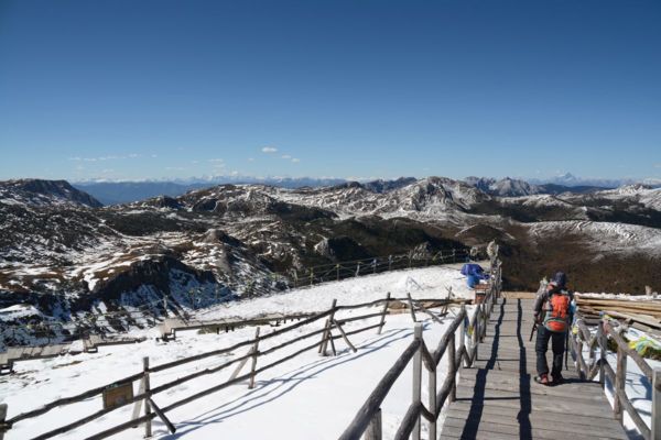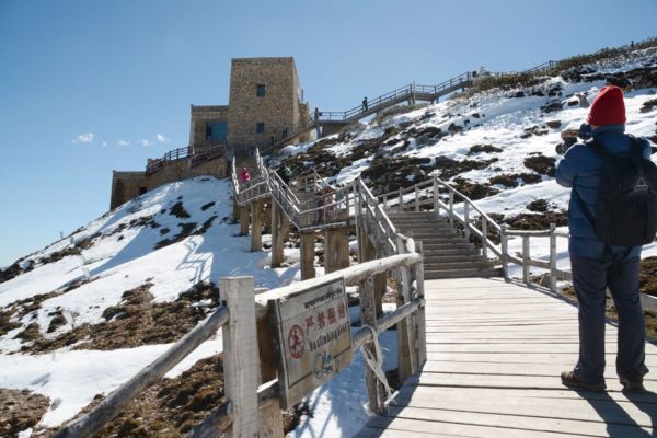 冬季石卡山成為夢幻世界,藍天下,白色的雲朵、白色的山巒、白色的草甸和白色的藏房,講述著一個美麗的傳說。石卡山景區生態景觀的動態性,還體現在面山立體氣候的垂向變化上,從每年十月開始到次年五月近八個月的時間,石卡山頂總是白雪皚皚,也正是有了石卡雪山,保持住了雪山草甸的香格里拉印象。納帕海纜車站外爬一段木質階梯到達山頂,海拔