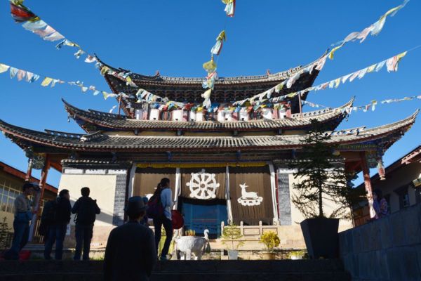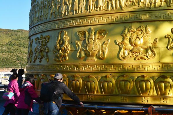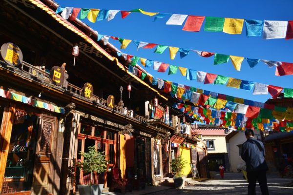 續走迪慶藏族自治區遇獨克宗古城,有著1300多年悠久歷史的茶馬古道重鎮,獨克宗古城是按照佛經中的香巴拉理想國建成的,唐儀鳳、調露年間(西元676-679年),土蕃在這裏的大龜山頂設立寨堡,名獨克宗,一個藏語發音包含了兩層意思,一為建在石頭上的城堡,另一為月光城。香巴拉是一個隱藏在雪山中的神秘王國,國中居民不執、不迷、無欲,歷代神聖國王,為未來的世界保存了良知與文明的有生力量。城中大龜山上佇立著世界上最大的轉經筒,轉經筒高
