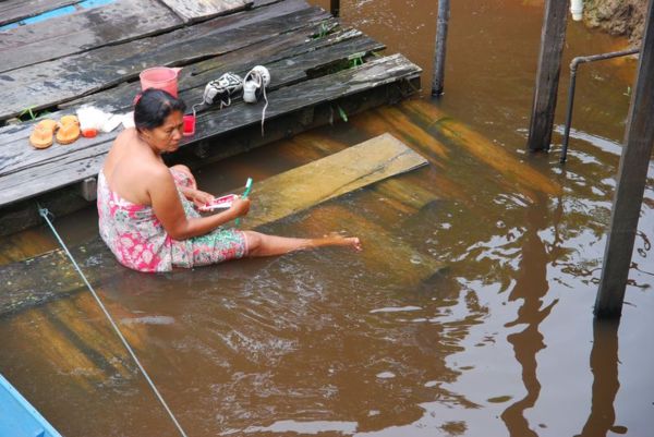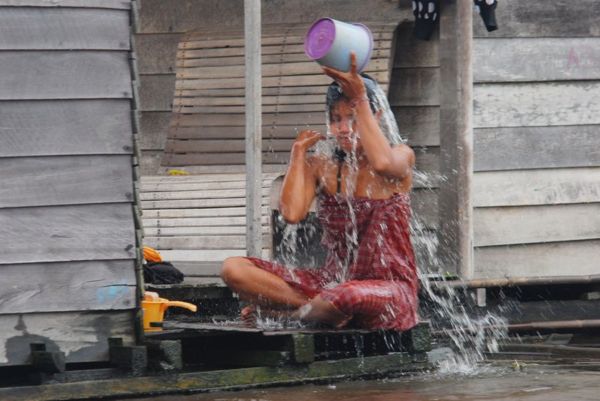 帶團印尼20天,在加里曼丹前往芒瓊Mancong另一土著鄉村,途經叢林彎曲水道沼澤區,村中有一家是古老的長屋,3百年歷史,保存得非常完美,內住了20個家庭。在沿路的河上,印尼接近赤道的天氣,常看到兩旁印尼老百姓一天總要露天沖涼好幾回,偶爾也會見到妙齡女郎當「街」淋浴,讓我們「眼睛吃冰淇淋」,只是無論洗澡、洗臉、刷牙都在河裡,恐怕我們還無法適應。
