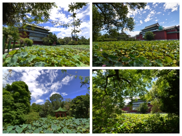 炙熱的天氣,看看荷花,竟成為我的功課了,我何時拘泥於規則了,還是台北植物園是我唯一夏季的心動嗎?抬頭一望,藍天白雲襯托了歷史博物館,荷花池畔荷花綻放著,很多已經結實成蓮蓬,荷花剩下的不算多了,連蓮蓬都有的爆裂,枯了,有的荷葉也已顯得老態,跟我的年齡接近,突然覺得自己不再年輕了,還以為自己停留在四十歲的人;以景寄情,寓情於景的荷花啊!似乎居然在此無意間嘲弄了我,妳還真含蓄呢,沒有說出來,像是暗示了我,像老朋友的台北植物園荷花,不僅「嬌」而且「欲語」,不特「欲語」而且十分媚人,終於開始,默默嫵媚微笑著提醒了我。