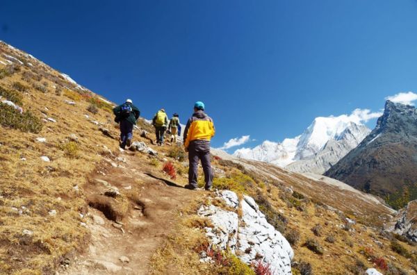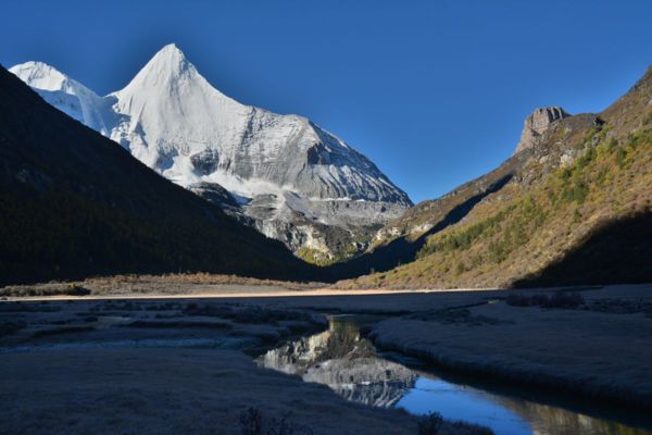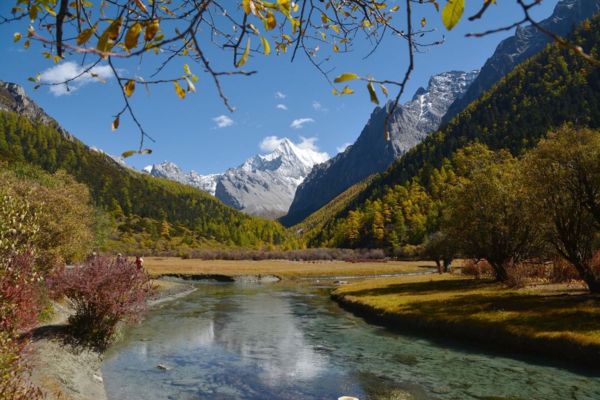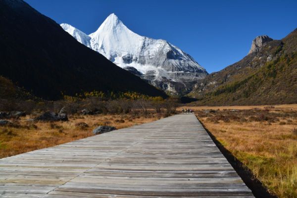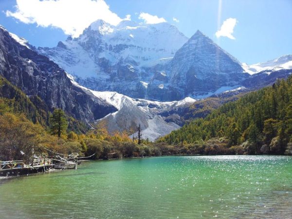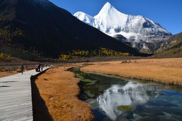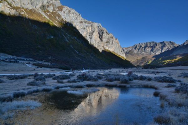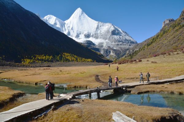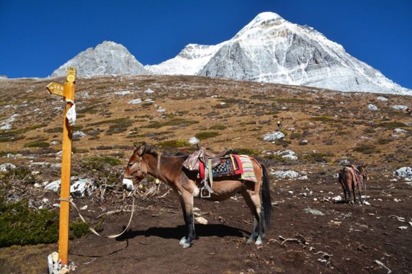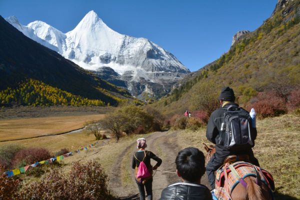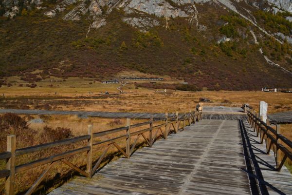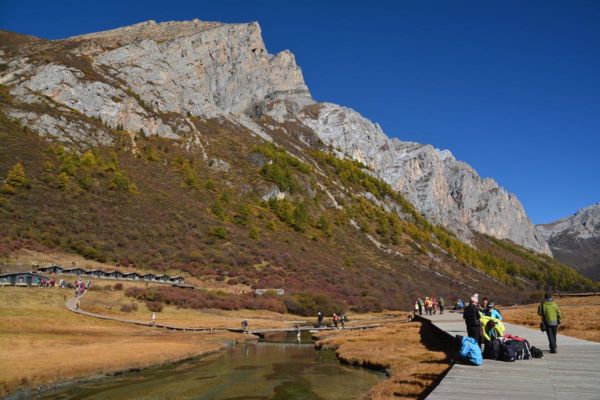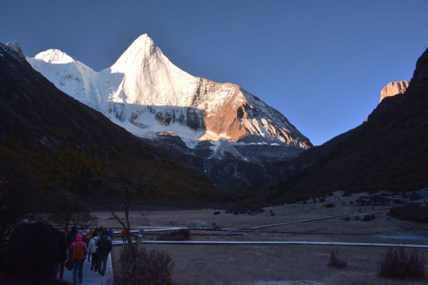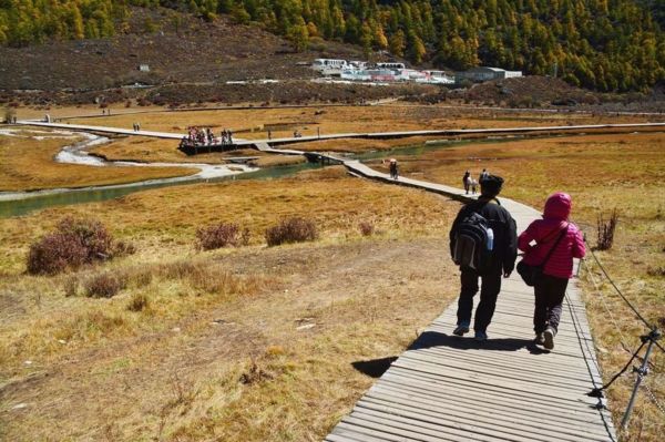 清晨天沒亮就要起床,寒風冽冽,早餐無法要求,客棧老板誠意提供服務已不易,暖了胃即搭乘整排環保車,一群人搶第一時間到亞丁景區大門,再搭第2段電瓶車約20分鐘7.5公里上坡路到達洛絨牛場(海拔4180m),進入真正的香格里拉。這裡氣象萬千,晶瑩的雪峰環繞寬闊的草場,縱橫交錯的溪流,色彩斑斕的海子及五彩繽紛的森林、溪流以及雪線下形成的瀑布,十分美麗壯觀,而仙乃日神山(觀世音菩薩),為稻城第一高峰,央邁勇神山(文殊菩薩),夏諾多吉神山(金剛菩薩),三座神山環繞四周,雄奇驚嘆。山邊一角有遊客中心,免費提供熱水供泡麪、熱茶,成為亞丁風景區最名的觀光勝地。大部份遊客到此就被吸引住,不用再冒險由小徑登山,足夠細品山光水色。