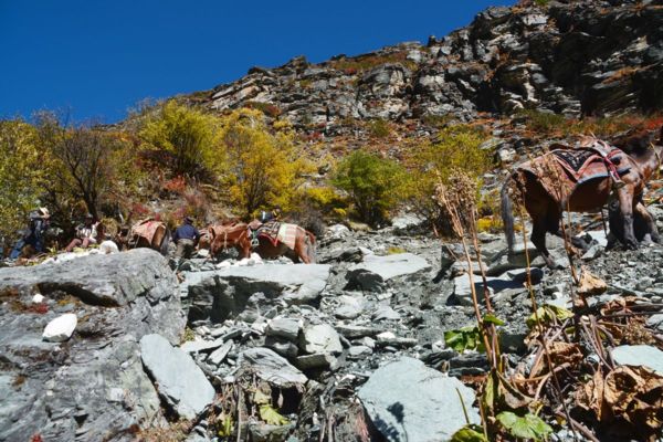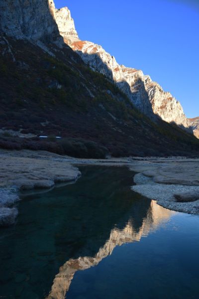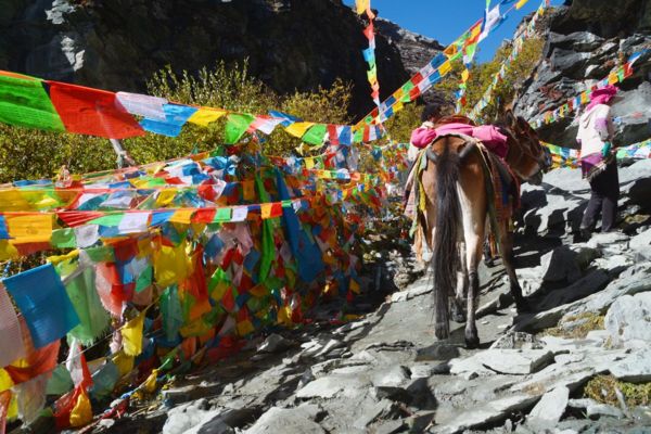 我們一大早趕上洛絨牛場,除了要拍晨曦第一道曙光照射山頭,以及反映溪水的絕美景色,還要搶第一批藏民馬幫經營的約30匹馬上牛奶海,來回藏民只給3小時(因為他們還要多走幾趟)。騎在馬背上其實也不輕鬆,小徑顛簸異常,忽左忽右、忽起忽落,還要預防野草枝葉,來到4300公尺尚有一段亂石流水陡坡,馬伕一定要你下馬攀爬,為趕時間還不斷在你左右催促嘲諷,在這裡真是氣喘吁吁,幾乎達到肌力極限,難怪很多人無法通過這關,放棄登頂落荒而返,就正中馬伕下懷,他可節省時間多作一次(每次¥300,有時嫌體重或攝影器材重加價¥50)。驚心動魄終於上到牛奶海(4400公尺) ,這裡可很清楚的欣賞到仙乃日神山(北峯仙乃日神山6032公尺意為觀世音菩薩,為稻城第一高峰),繞一圈約20分鐘,湖面不大。欣賞奇景不久,得打起最後精神再徒步向上爬至4800公尺五色海,這是藏區著名的聖湖,佛經中讚譽該湖與西藏羊卓雍措齊名,有很多宗教上的傳說,在當地人心目中,五色海是一個神湖,能返演歷史、預知未來。我無法流連忘返,衝下坡趕上回程馬匹,在馬背上搖晃下山,此時心境已鬆、肌肉已散,就算回到山下,仍然迴腸盪氣所見所聞好一陣子。