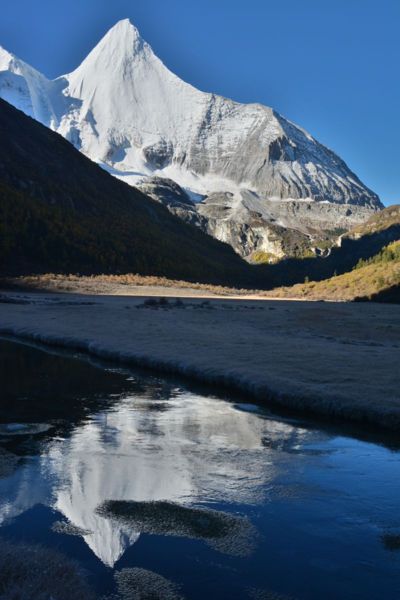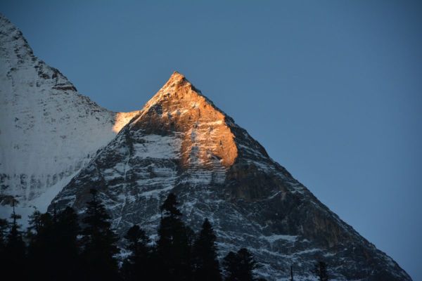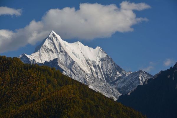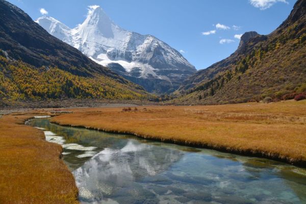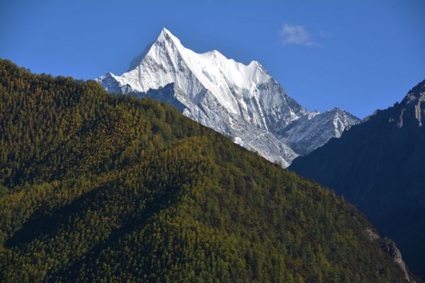 亞丁位於稻城縣日瓦鄉境內,念青貢嘎日松貢布(亞丁自然保護區)方圓千餘平方公里,主體部分是三座完全隔開,但相距不遠,呈品字形排列的雪峰,相傳為約西元750年由印度啟程往西藏弘法烏仗那國(即今之斯瓦特)的印度僧人蓮花生大士 (Guru Rinpoche),以佛教中除伏主人翁的三位一體菩薩觀音、文殊、金剛手分別為三座雪峰命名加持:北峰「仙乃日」,意為觀世音菩薩,海拔6032公尺,似大佛,慈善安詳,溫馨平和;南峰「央邁勇」,意為文殊菩薩,海拔5958公尺,如少女,端莊嫺靜,冰清玉潔;東峰「夏諾多吉」,意為金剛手菩薩,海拔5958公尺,像少年,英俊剛烈,神采奕奕。三尊聖靈,在天空與大地間,在神界和人界,共守一方淨土。雪峰周圍角峰林立,大大小小共三十多座,千姿百態,蔚為壯觀,為我們營造出一片靜謐、安詳的世外之境。稻城神峰的美,不比喜瑪拉雅山聖母峰的蒼勁雄奇,也不如梅裏雪山的艱險詭秘,而在於稻城那濃郁神秘色彩的獨特個性。每當雨霧朦朧,雪山神姿若隱若現,宛若天仙,麗日晴天則碧空如洗,亮麗的白雲伸手可摘。雪峰、森林、海子、草地、溪流間曲曲彎彎的小路上,遠遠近近那些朝聖的善男信女,拙樸的服飾,口中低誦經文,眼裏閃出普羅眾生的光,向山神參拜,向蒼天和大地祈福,影響所及那些大自然之山羊、猴子、野鹿…悠然自得。
