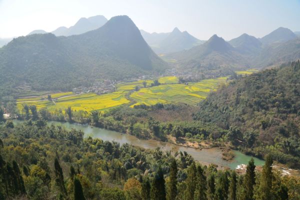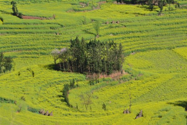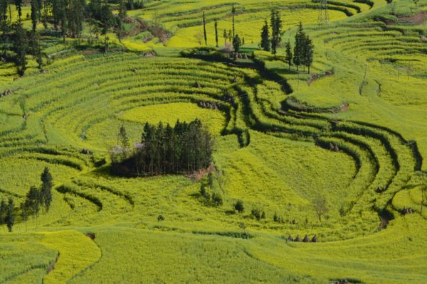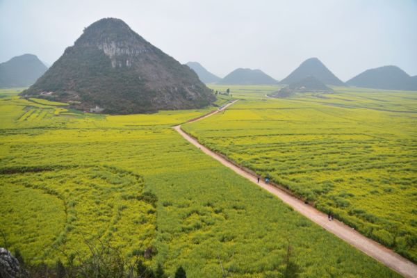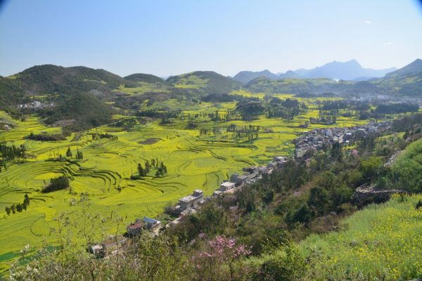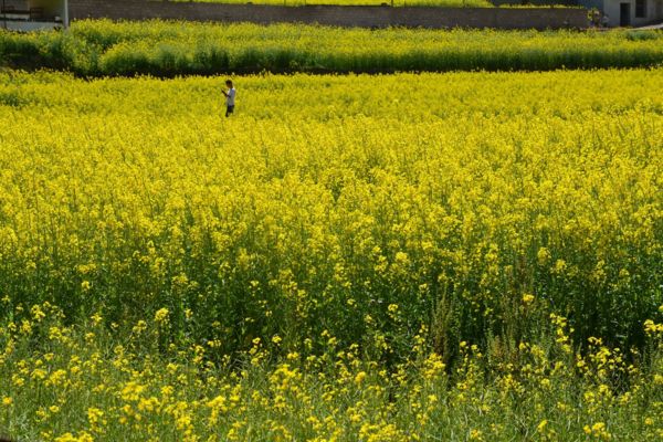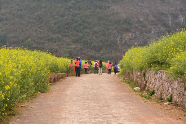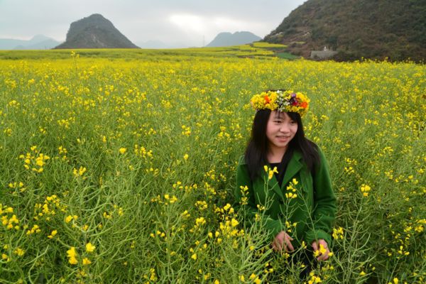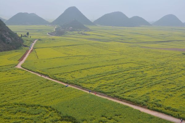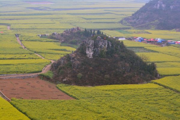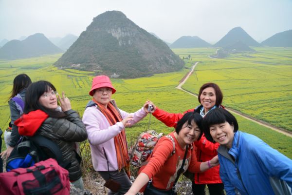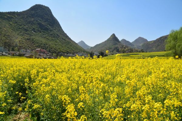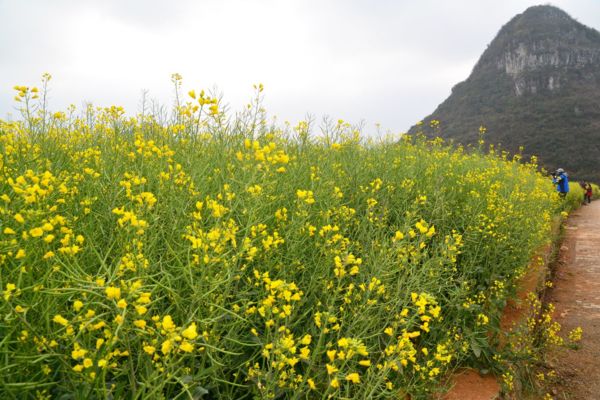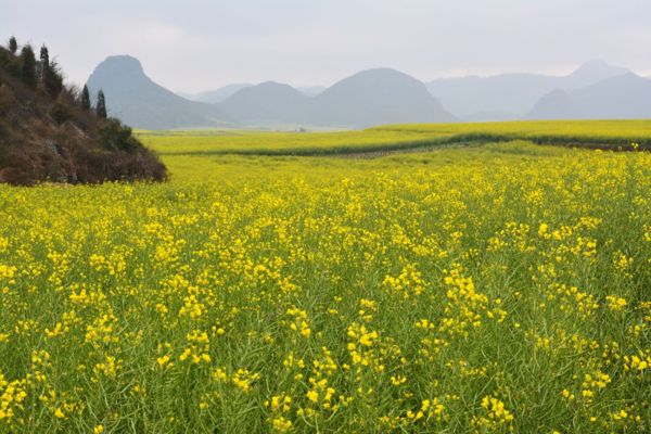 前文大就是美系列之一述說元陽梯田,我們接著抵達羅平,當車馳騁接近羅平,就感到黃金花田遍佈,所有的團員都驚呼連連,長途的疲勞一掃而空。2002年,萬畝油菜花海被上海大世界珍氏紀錄授予“世界最大的自然天成花園(油菜種植園)”稱號;2005年,羅平金雞峰林被中國地理學會評爲“中國最美的峰林”。近幾年來,各地都在發展地方特色,把冬天油菜花田列入整體的觀光項目之一,油菜花成爲吸引觀光的最佳綠色資源,油菜不但可以是有機綠肥,還可增加觀光收入,印證了綠色環保概念與經濟是可以並存的。若論油菜花,青海門源面積最大約百萬畝,江西婺源也好看,但雲南羅平的油菜花最爲著名,交通建設最好也最方便。在大陸,油菜花觀賞的時間爲每年的十二月底到來年月四月,台灣南部十二月份即可開花。