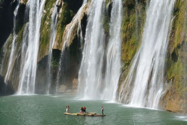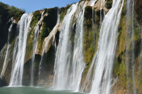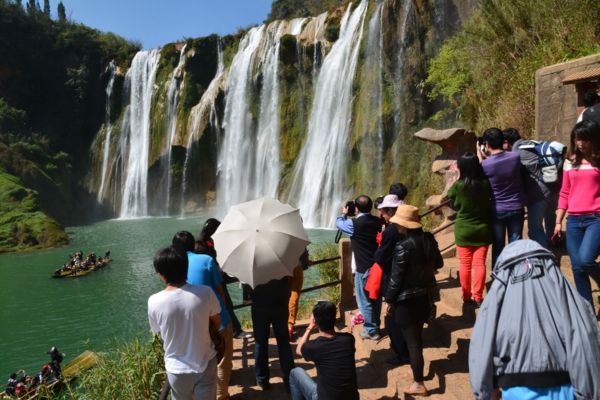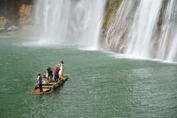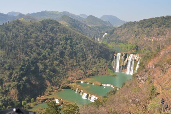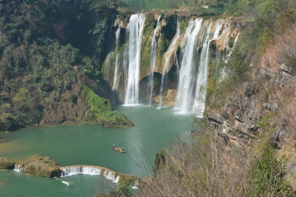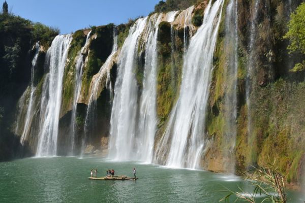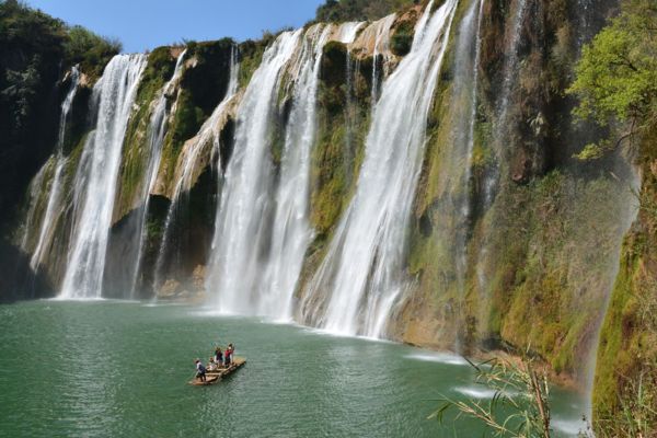 到羅平景點也可說是「金花銀瀑」,除了金花是金黃色的油菜花,銀瀑指的是九龍瀑布。九龍瀑布位於羅平中心東北方22公里處,這是中國最大的瀑布群,被譽為中國最美六大瀑布之一,河道全長約4公里,論氣勢及規模與貴州西南部的黃果樹瀑布不相上下。由於特殊的地質構造和水流的千年侵蝕,在此形成了十級高低寬窄不等,形態各異的瀑布群,其中最大的一級寬112公尺,高56公尺,氣勢恢宏,蔚爲壯觀,號稱九龍第一瀑(神龍瀑)。我們由入口的山上向下遠望,可一目盡覽十瀑,瀑布奔流直下,蔚為奇觀。九龍瀑布群堪稱世上最密集、最富特色的瀑布群落,景區由鈣華臺階、月牙湖、碧日潭、戲水灘、蝙蝠洞、九龍第一瀑、九龍第二瀑、九龍第三瀑、石龍漫遊瀑、九龍合流瀑、大必車灘等十個景點組成,「九龍十瀑」因此被譽為中國最美的瀑布,當地布衣族稱之為“大疊水”,而深情款款的多依河,清秀綺美,風光奇絕,景色清雅,沿途景觀可看到十餘個鈣化灘,層層疊疊,錯落有致。