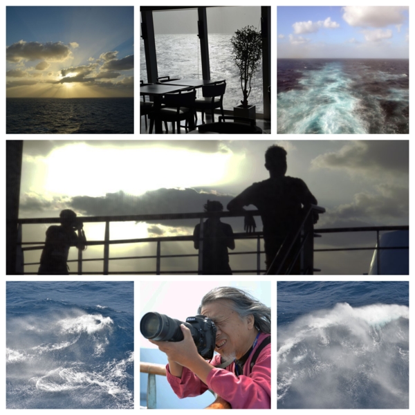 慢跑道上與香港客交會,交談一位中老年人,原來他們來台乘遊輪團,是含了兩天台北遊,還說香港送中主要是政治問題,情況不如我們形容的糟,是蔡英文借槍打鳥,還是台灣新聞界只是言亂其實,恐怕香港客及我也都難窺其奧。也遇到幾位拿著攝影大砲的客人,是台北攝影協會的,介紹了林聲大師,他問我對沙龍攝影的看法,我說尊重攝影路線,我喜歡報導攝影,隨機速寫,不喜歡擺拍、不喜歡刻意安排純美畫面,也不喜歡到哪裡都拍日出、日落、星軌夜景,交談之下,他講了很多哲理言論,一副名仕派打扮不修邊幅,原來他開班教攝影,由他處也獲很多啟發,十月二十日將在爵士藝廊開攝影展,這次主題是海浪,他們專注拍遊輪產生的浪花及曇花一現的浪花彩虹,彼此談得很有趣,我也順勢拍幾張浪花。