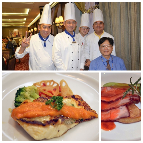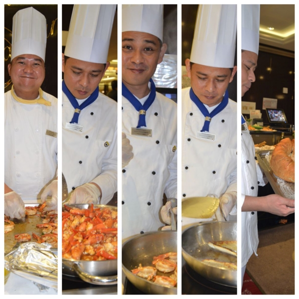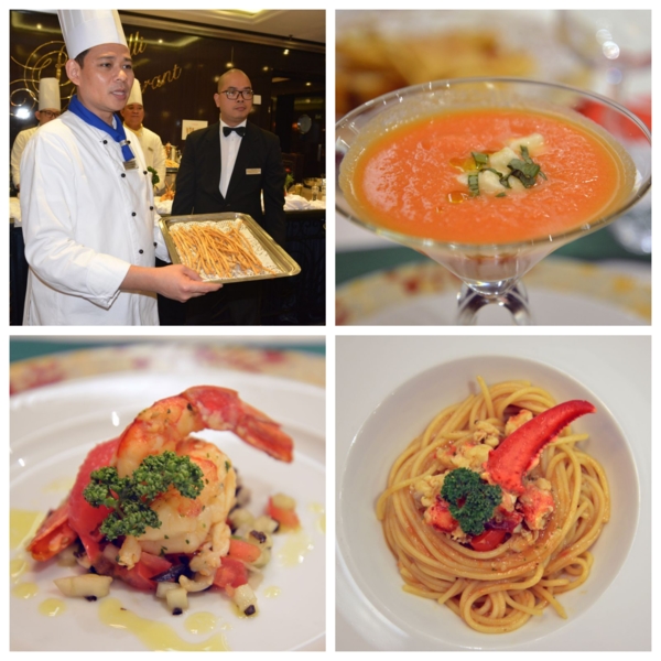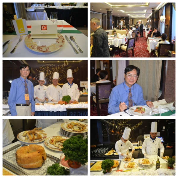 輪到這趟的重頭戲,1800到八樓Botticelli餐廳用主廚特別晚宴Menu Chef’s Table,我也換上襯衫打領帶,幾乎大家都盛裝了。四位主廚、八位服務人員,加上主管及酒保都來伺候,場面重大,全部義大利名菜一道道現場表演並解說,正常晚餐客人從旁邊走道經過,看陣勢及聞香,不得不側目,我因為一人參加,座位安排首席,正好方便拍照,出了風頭。第一道意式麵包、方餅、火腿起司麵包、烤長手杖餅乾,第二道馬蘇里起司羅勒番茄冷湯,第三道香煎大蝦配西柚汁,第四道龍蝦義大利麵,第五道香煎海鱸印尼醬哈密瓜沙拉,第六道密汁豬肉烤馬林薯,此道為特別經24小時醃漬、6小時低溫烹調而成,第七道巧克力布郎尼榛子冰淇淋水蜜桃片,義大利冰淇淋真是美味,我向小姐又多要了一球。花了兩個鐘頭,一道道品嚐,全部只美金50元刷卡還不用另附小費,台北五星級飯店至少要三四倍價錢,超值享受,難怪30位客人滿座,其中四位客人還是昨天我推薦給他們的,很有成就感。